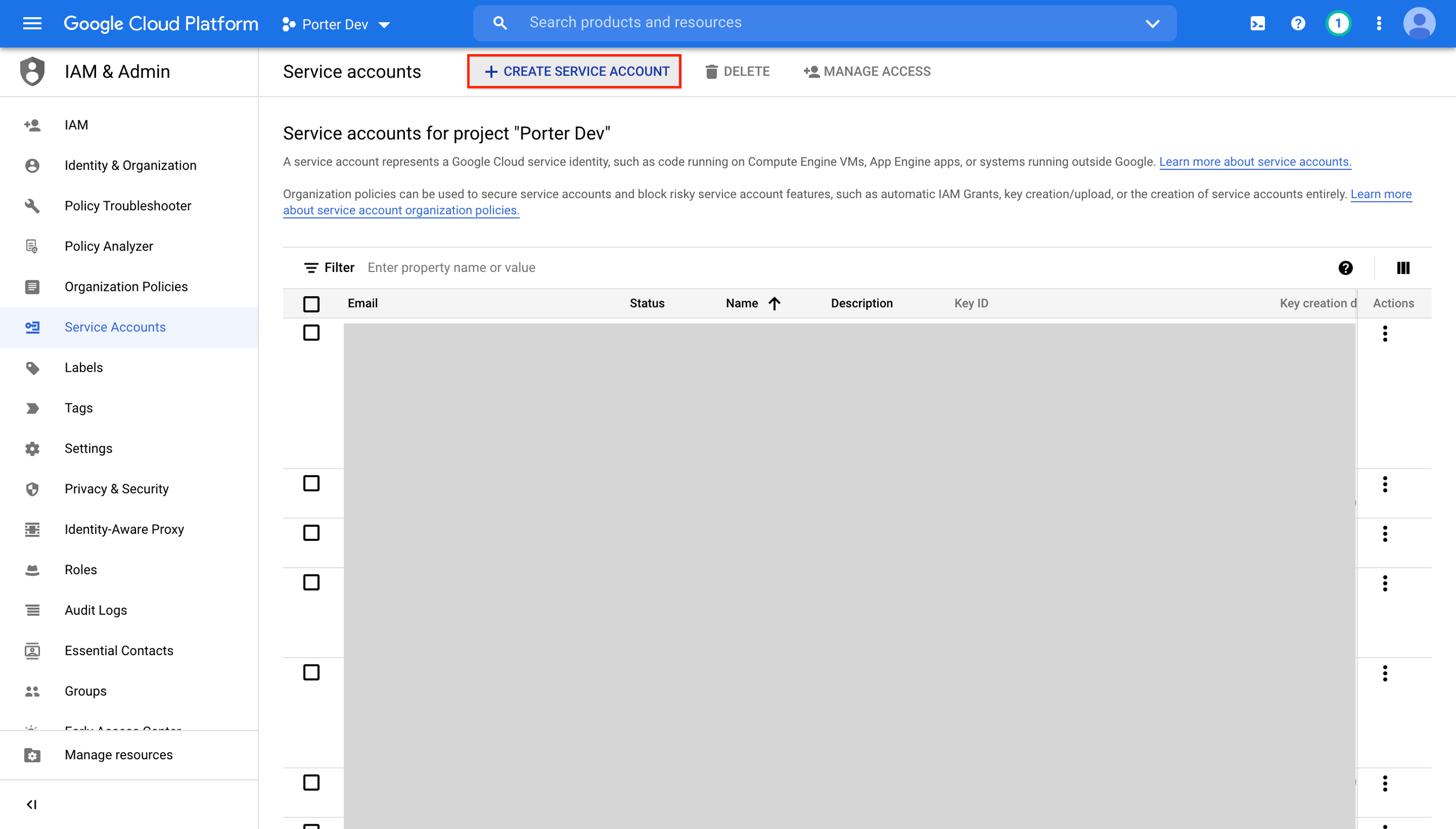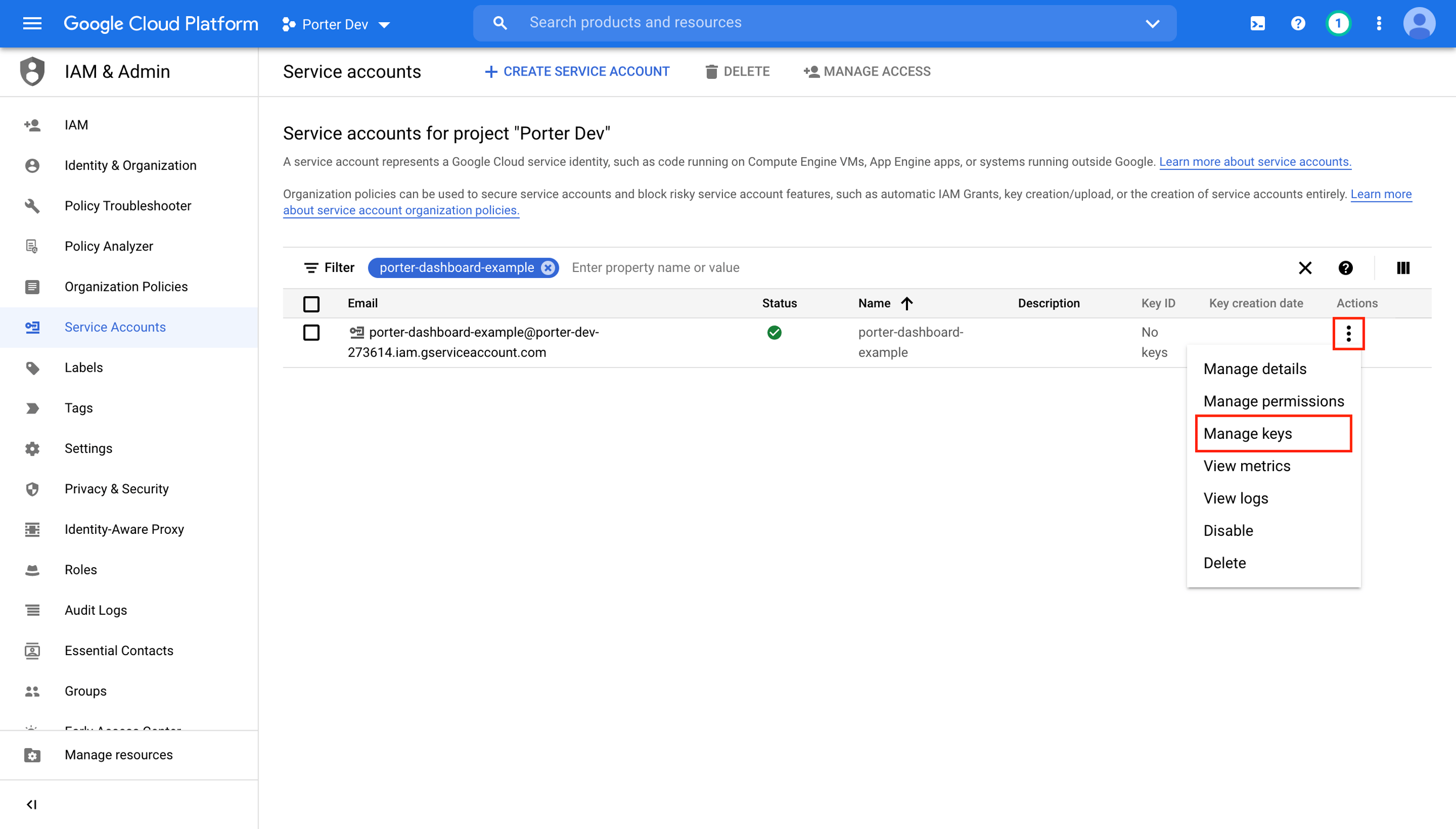 - Once the service account has been created, under Actions select Manage keys.