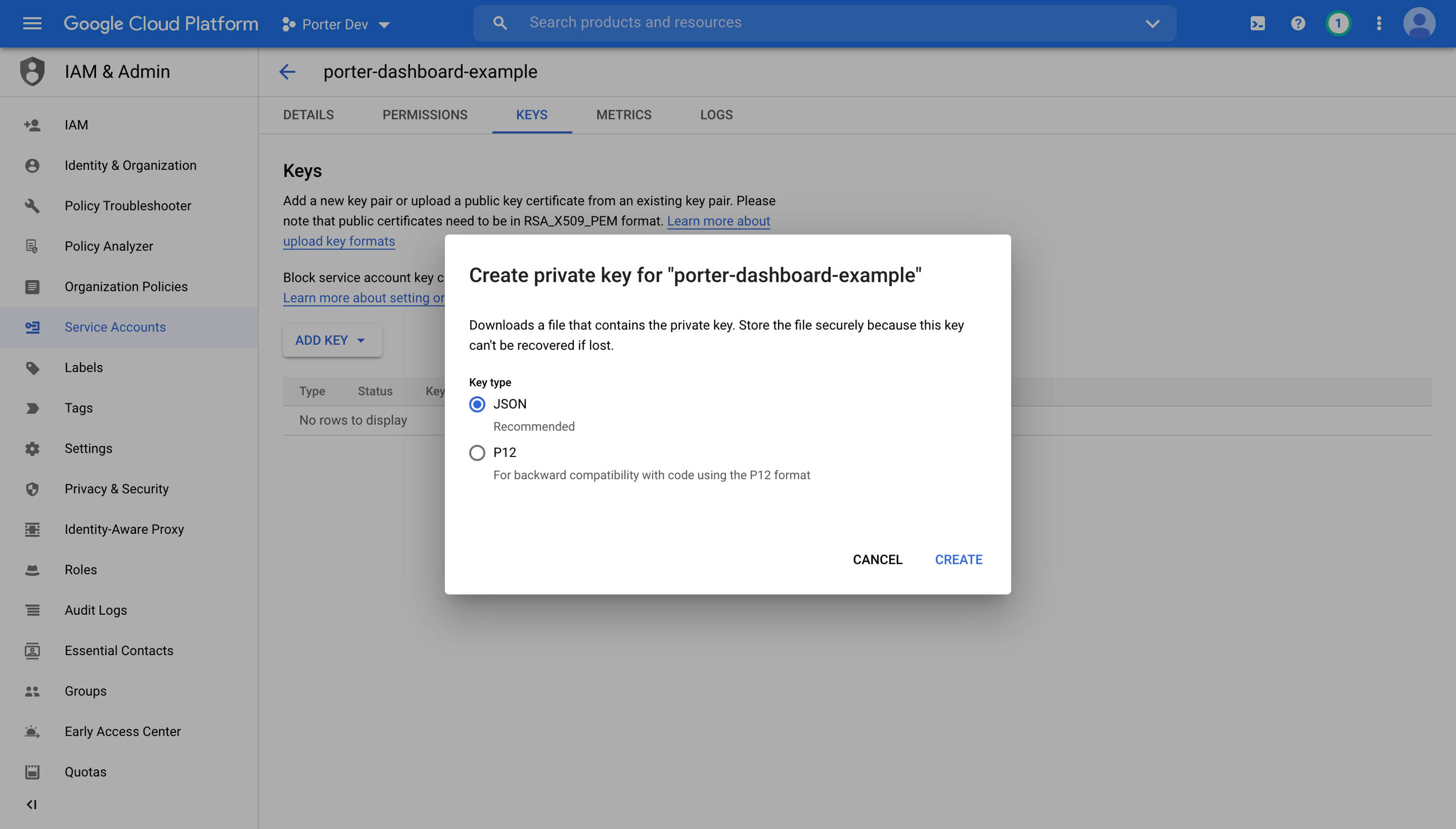 - Select ADD KEY -> Create new key and then choose JSON as your key type. After creation, your JSON key will automatically be downloaded as a file. You will need this key later.