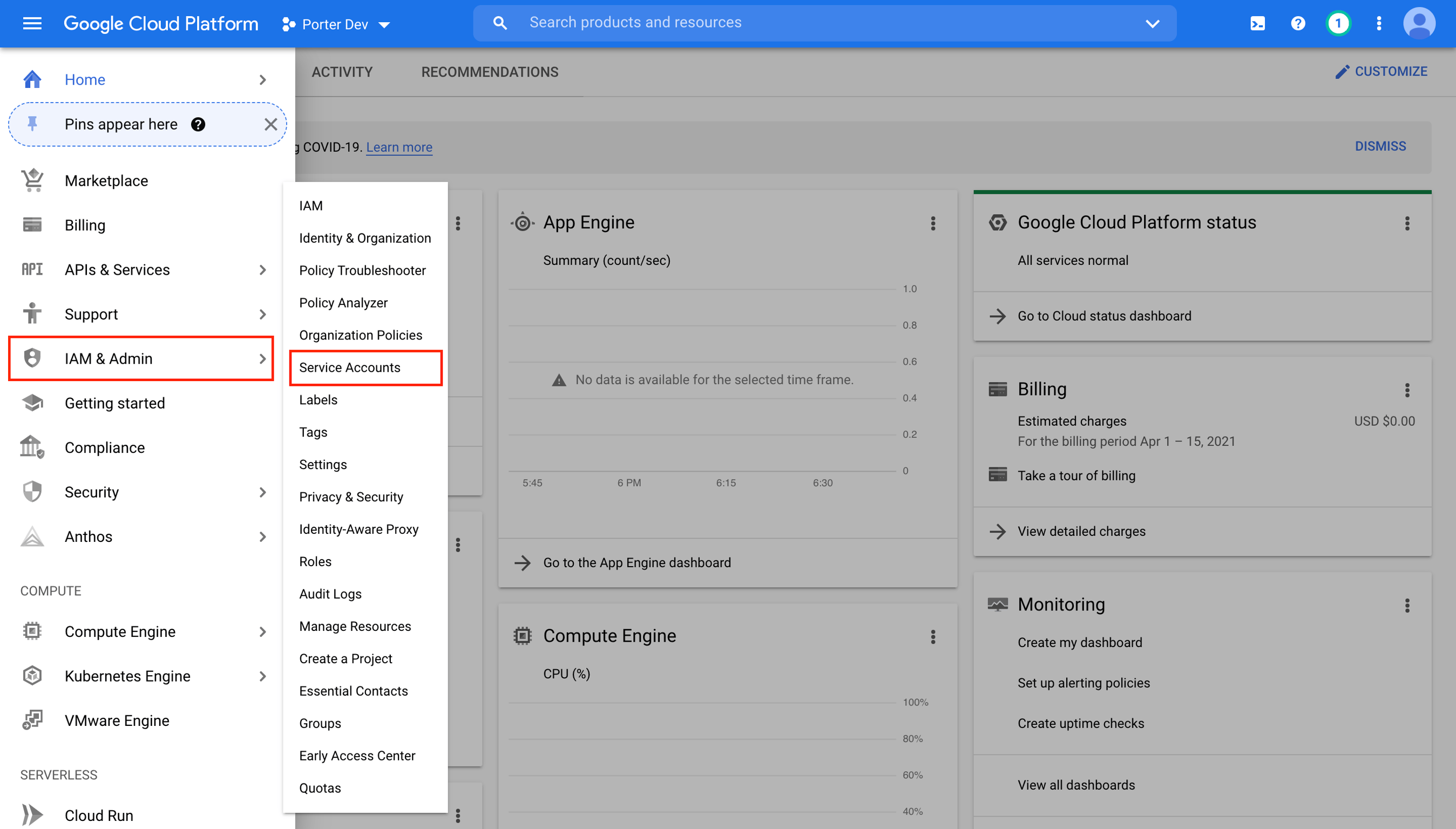 - First, go to your Google Cloud console and navigate to IAM & Admin -> Service Accounts: